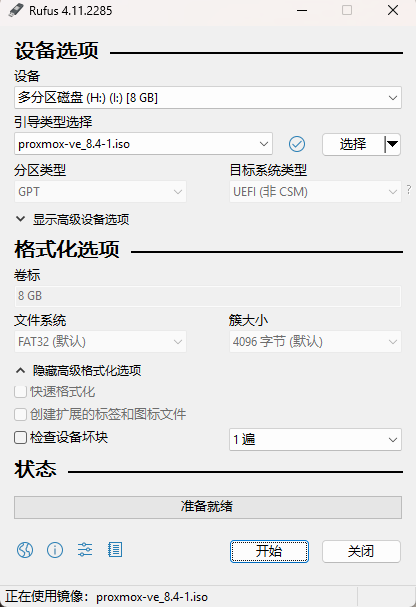 - 这里使用Rufus演示,插上U盘后打开会自动识别U盘,选择需要制作的IOS镜像包,然后点击开始即可,等待完成