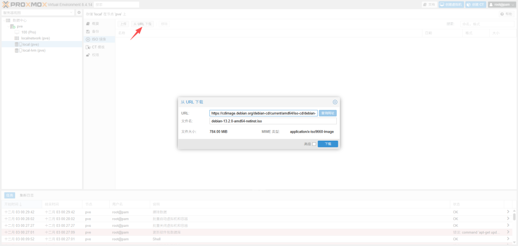 - 复制官网下载链接,点击Pve节点,或者你自己设置的名称
