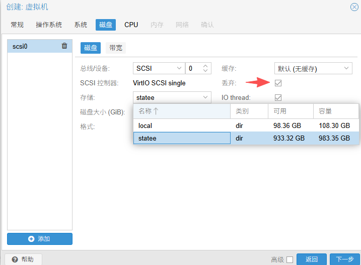 - 磁盘:大小:32G或自行填写。选择系统的 存储位置,勾选: 丢弃(允许节点回收没有 资料的可用空间