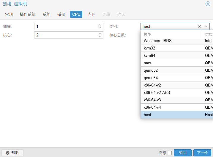 - CPU:根据主机的配置,进行分配即可,类别推荐选择:host