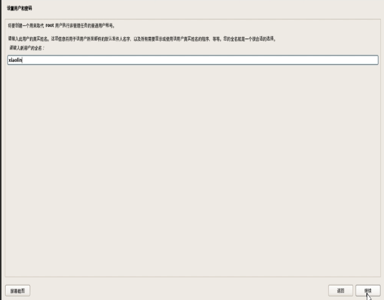 - 新建一个日常使用的用户名 :xiaolin,用户名要记住,同样比较关键(需要输入两次 【继续】