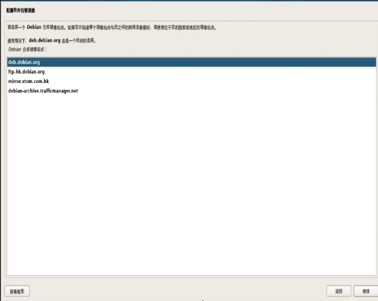 - 选择对应地区,选择第一个deb.debian.org (无图)【继续】