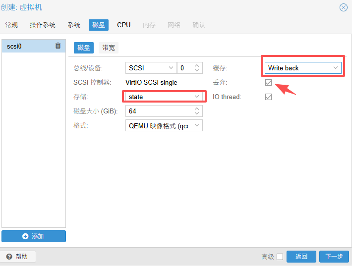 - 缓存下拉 选择 Write back【下一步】