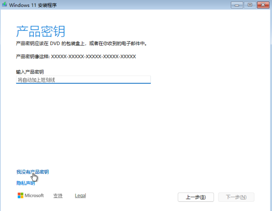 - 选择安装Windows 11,勾选我同意,点击我没有产品密钥【下一步】