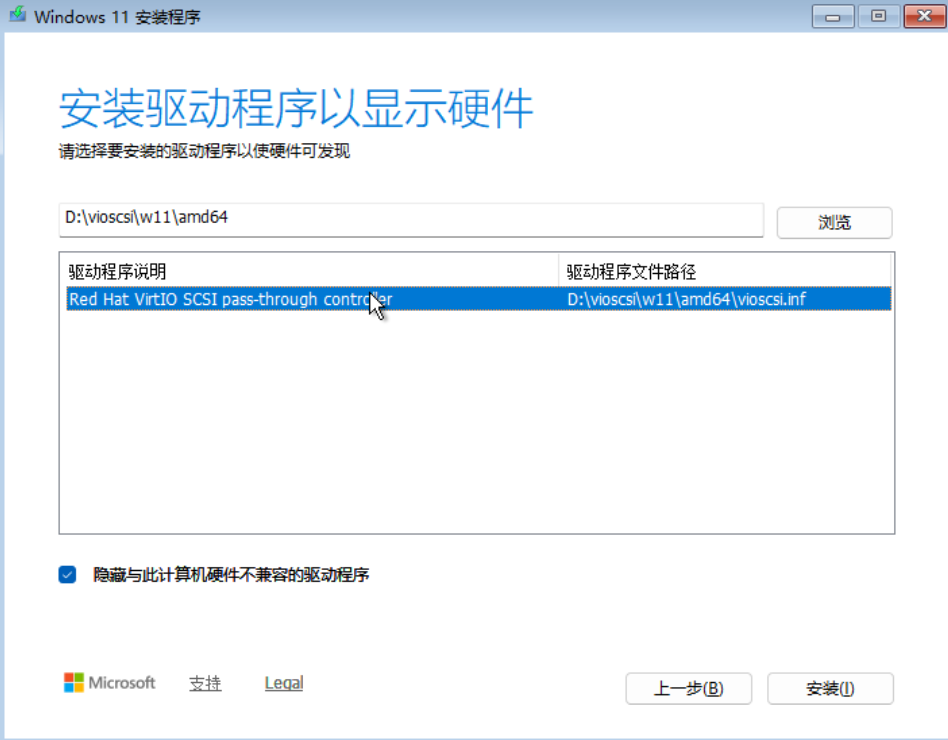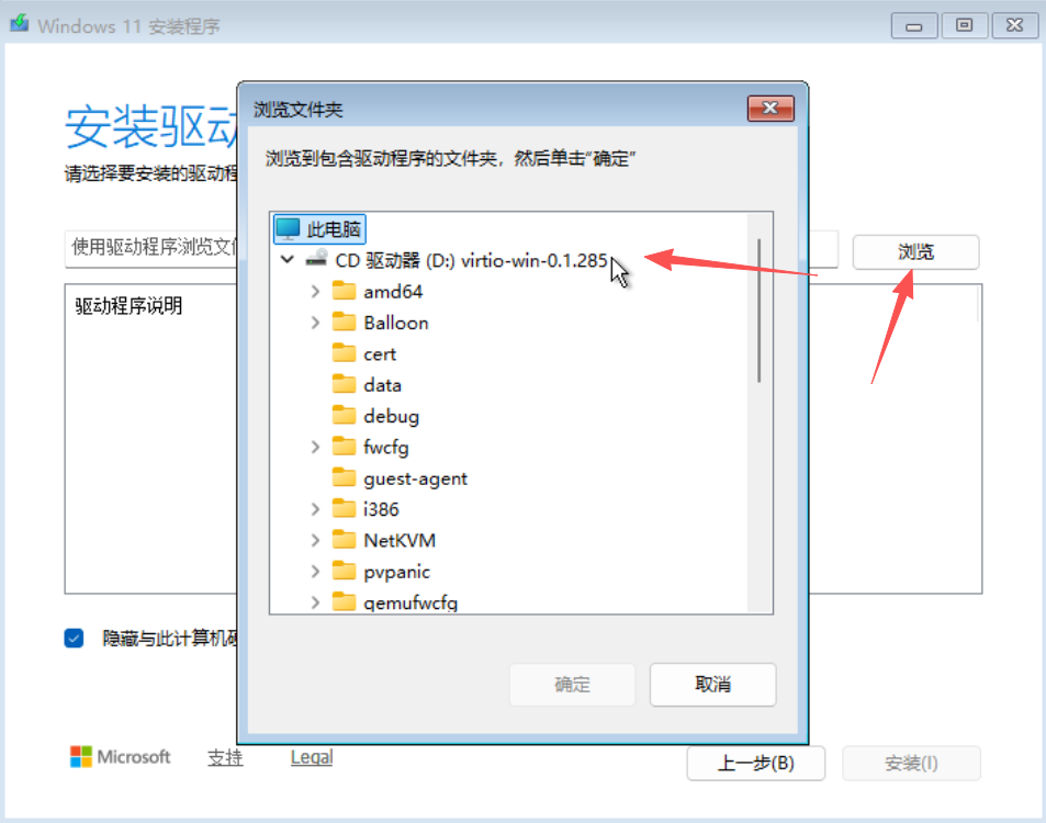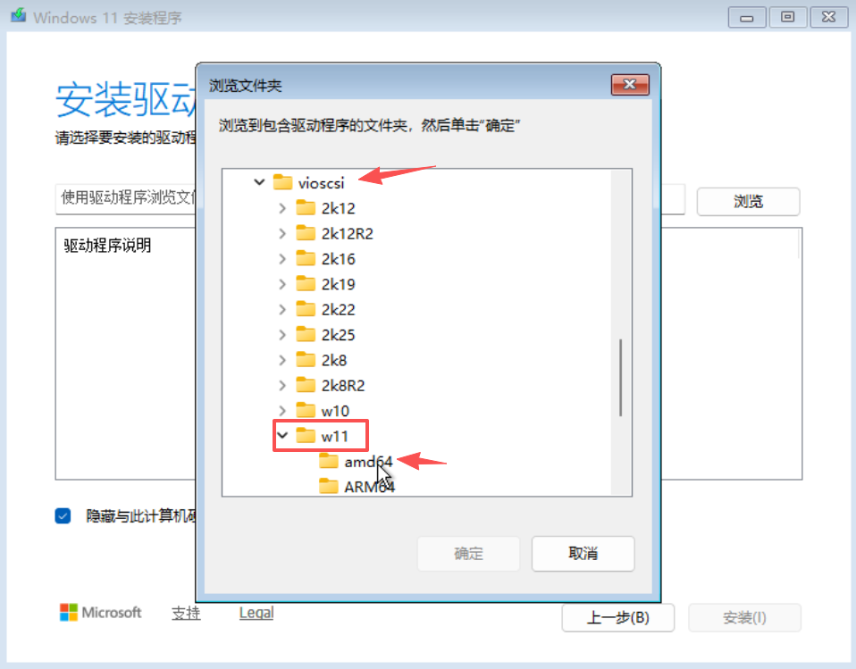 - 选择:加载驱动程序--->浏览--->virtio-win--->vioscsi--->w11--->amd64--->点击确定
