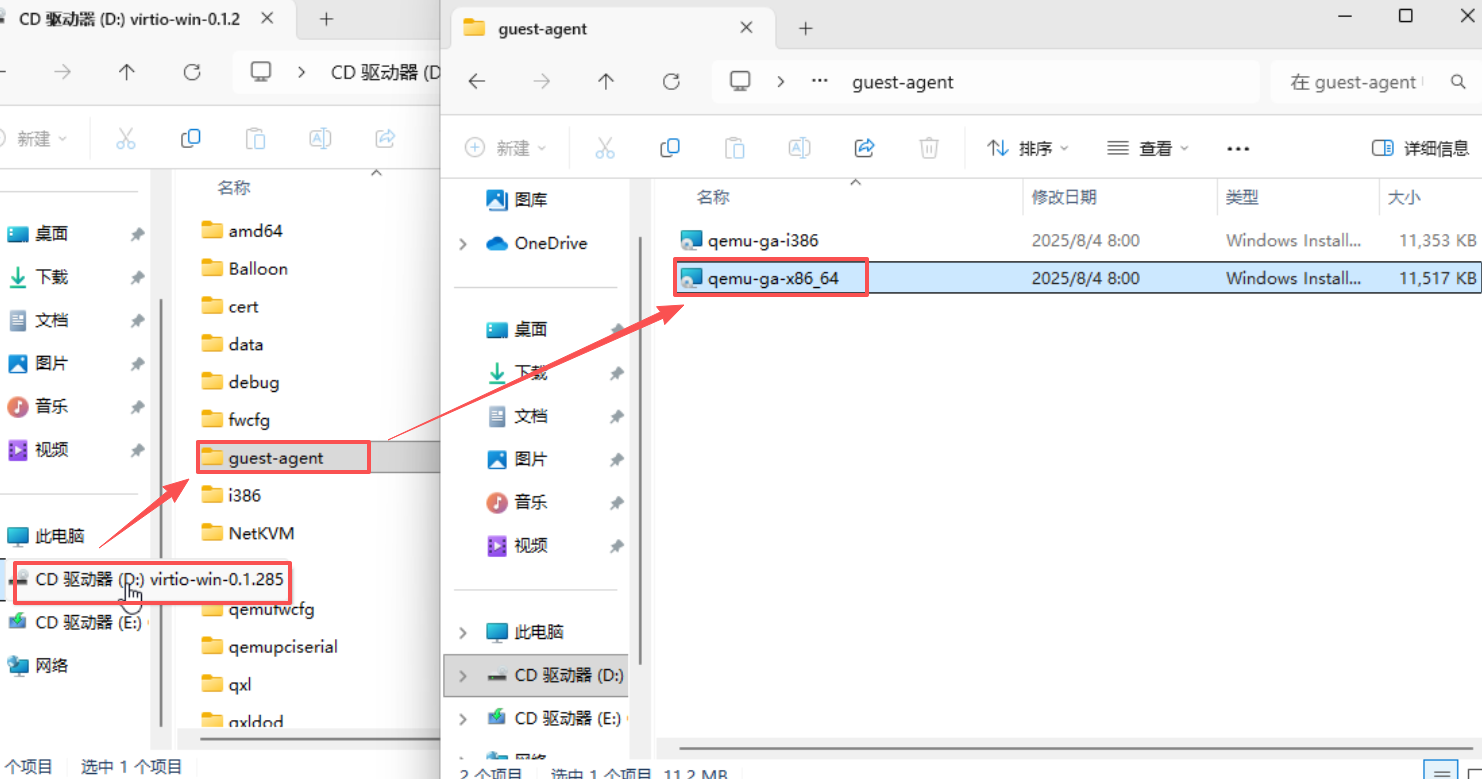 - 在左侧选择:CD光碟盘virtio-win,进入:guest-agent文件夹,运行qemu-ga-x86_64,弹窗点击: 是