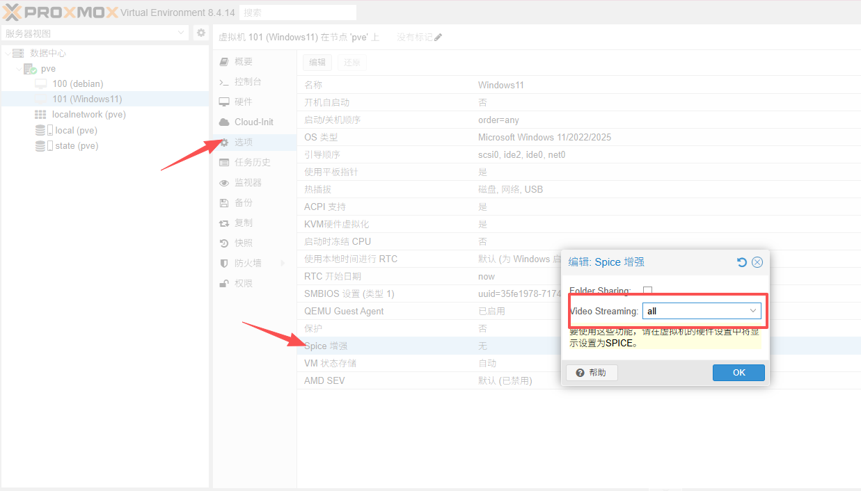 - 启动虚拟机,点击pve右上角的控制台,选择SPICE进行 主机连接