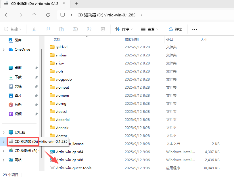 - 在左侧选择:CD光碟盘virtio-win,滑动到最下面,运行:virtio-win-guest-tools