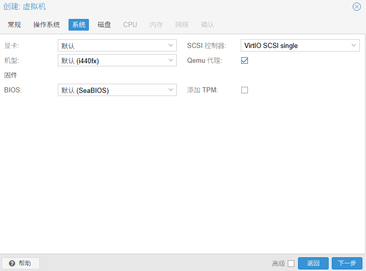 - 系统:勾选Qemu代理【下一步】
