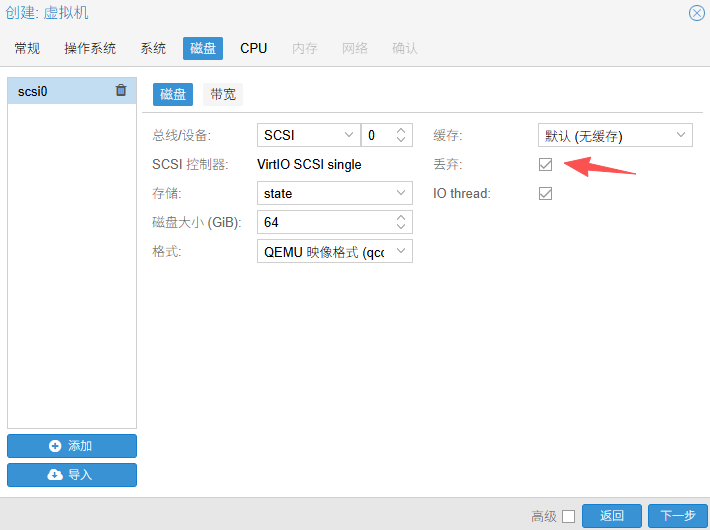 - 勾选丢弃,根据需求填写 磁盘大小【下一步】