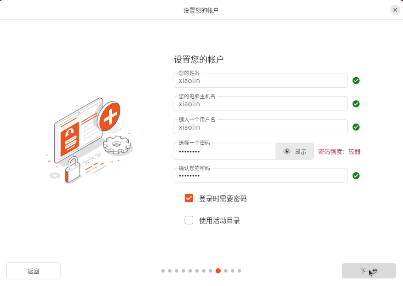 - 设置密码:注意密码比较重要,要记住!!!【下一步】