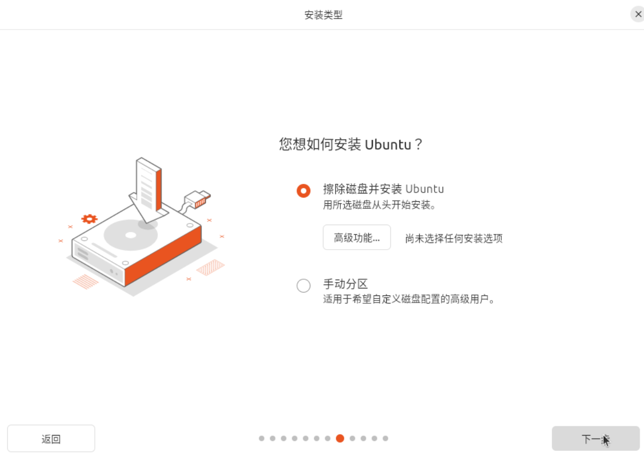 - 选择擦除磁盘并安装Ubuntu【下一步】