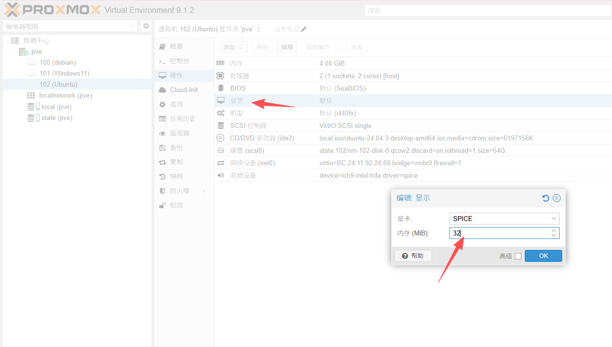 - 双击:显示,设置内存:32,选择SPICE